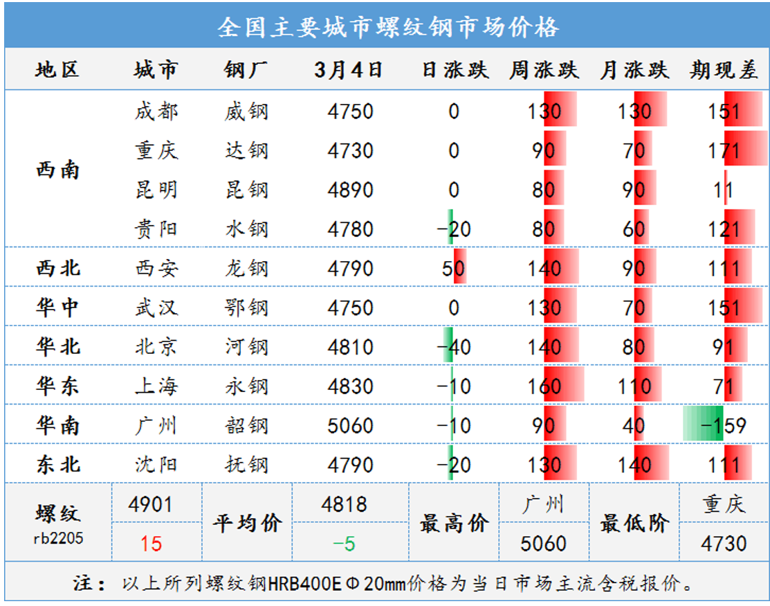 近期俄乌冲突加剧,国际大宗商品价格普涨,带动国内期货市场大幅上涨;铁矿、焦炭等原料价格持续上涨,市场炒作情绪进一步升温;目前正值两会敏感时间窗口,市场对利好政策存在预期,加之各地重大项目工程集中开工,对市场信心支撑较强,本周全国钢材市场大幅上涨。总体看,近期国际形势复杂多变,资本市场的频繁波动,对现货引导作用明显。